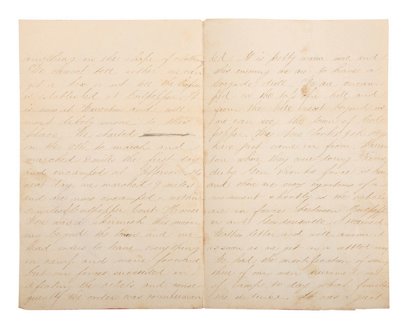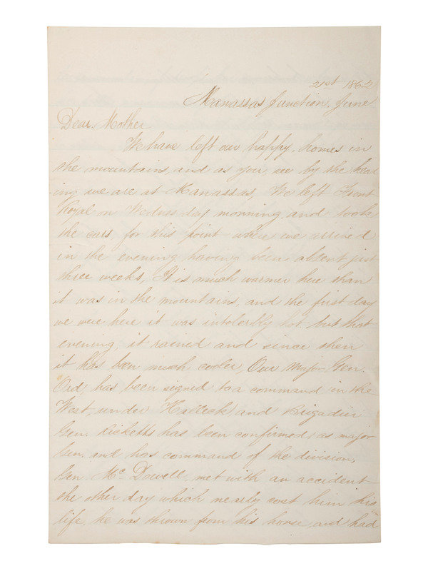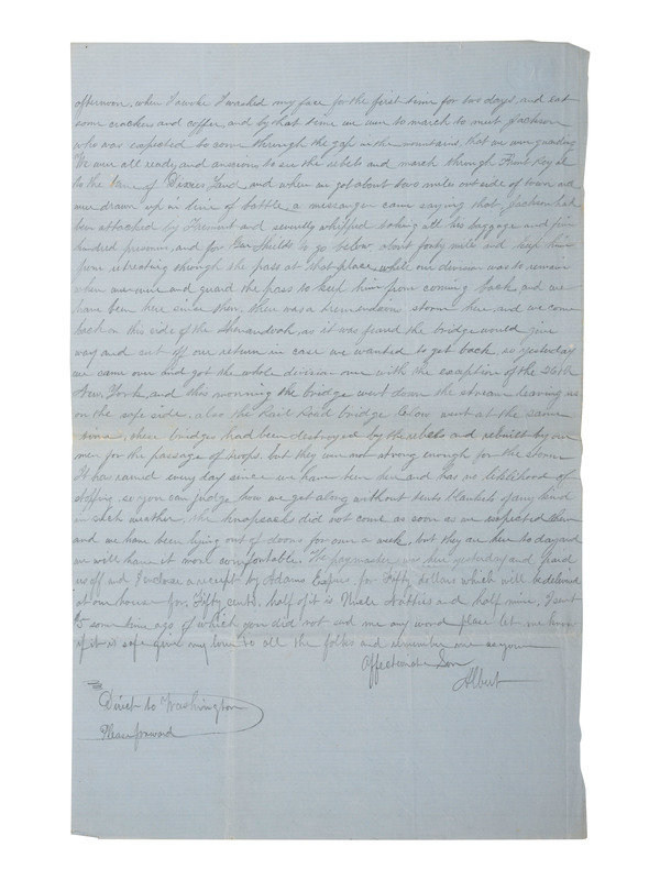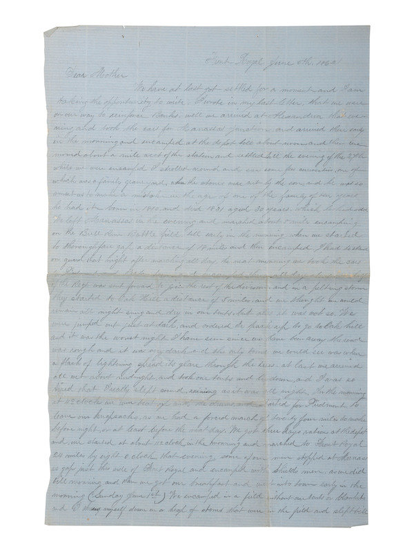 “…[we were] sent forward to join the rest of the division, and in a pelting storm they started to Oak Hill a distance of 5 miles and we thought we could remain all night snug and dry in our tents, but alas it was not so. …In the morning at 4 o’clock we were beat up with the drums, and started for Piedmont to leave our knapsacks, as we had a forced march of twenty four miles to make before night, or at least before the next day. We got three days rations…. We started at about 11 ‘clock in the morning and marched to Front royal 24 miles aby eight o’clock that evening…. We encamped in a field without our tents or blankets and I threw myself down on a heap of stones that were in the filed and slept till afternoon… we were to march to meet Jackson who was expected to come through the gap in the mountains that we were guarding. We were all ready and anxious to see the rebels and march through Front royal to the tune of Dixie Land, and when we got about two miles out side of town and were drawn up in line of battle a message came saying that Jackson had been attacked by Fremont and severely whipped taking all his baggage and five hundred prisoners… our division was to remain where we were and guard the pass to keep him from coming back, and we have been here since then. …this morning the bridge went down the stream leaving us on the safe side, also the Rail Road bridge below went at the same time. These bridges had been destroyed by the rebels and rebuilt by our men for the passage of troops, but they were not strong enough for the storm. It has rained every day since we have been here and has no likelihood of stopping, so you can judge how we get along without tens blankets of any kind in such weather. The knapsacks did not come as soon as we expected them and we have been lying out of doors for over a week, but they are here to day and we will have it more comfortable…."