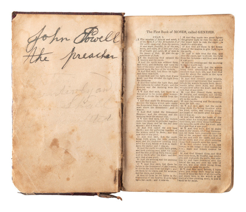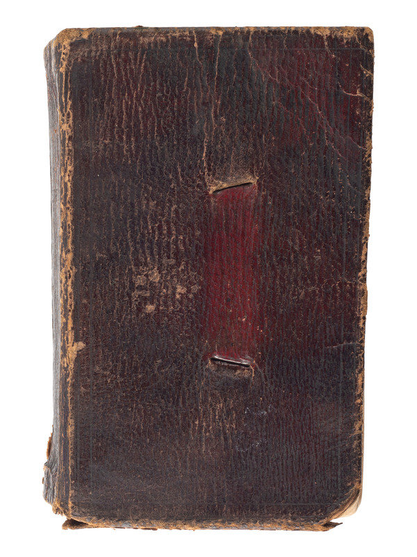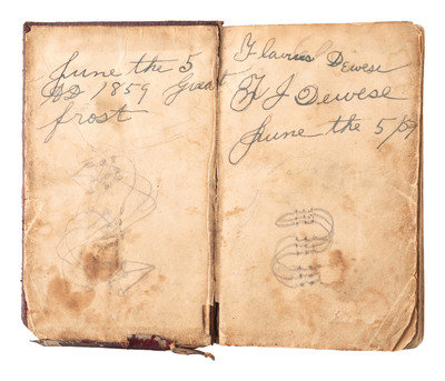 [With:] 2 3/4 x 4 1/2 in. leather bound Bible belonging to Dewese that was referenced above as being carried by him during his time with the 118th Ohio. The Bible, which contains both the Old and New Testaments, has leather covers, gilt edges and 978 pages (shows some wear, missing title page and table of contents). His name is written twice in pen on the front endpaper, once as “Flavius Dewese,” and just below it as “F.J. Dewese.” Also written twice is the date that he likely received the Bible (5 June 1859). In fact, one of the inscriptions reads “June the 5 AD 1859 great frost,” which was a day of chilling frost in Ohio and surrounding states that ruined the crops that were in the fields. Also contained within the front pages is the note “John Powell the preacher.” While lacking the first title page, a second title page is included before the New Testament (page 749), which lists the publisher as The American Bible Society (New York), and the year of publication as 1853 (the last page of Revelation is missing from the back and the rear inner hinge is cracked/opened but the binding is holding tight, the leather covers show wear, text pages are generally clean, with intermittent foxing, and the binding is tight).