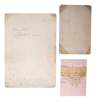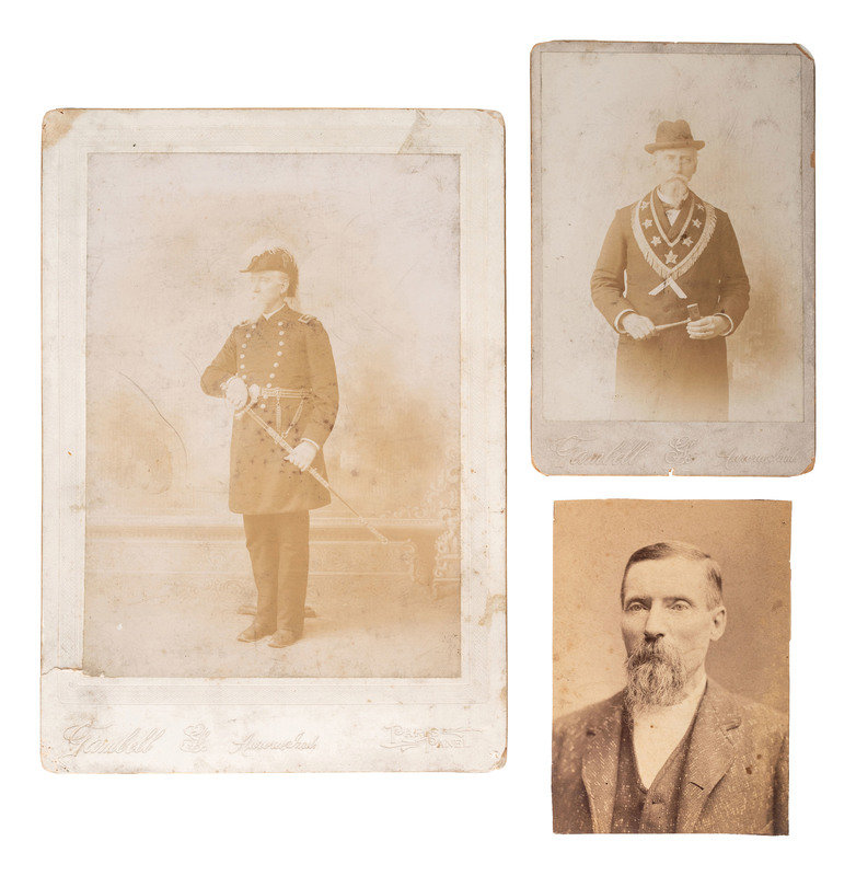 [With:] 3 post war photographs of Dewese. The first is a 3 1/2 x 5 in. cut-down cabinet card that provides a head and shoulders view (excellent contrast and detail). Dewese's name is handwritten on the back along with the note “I never knew Grandpa when he looked like this picture. Florence Dewese.” (Flavius had eight children, including five boys, and Florence is one of his grandchildren). -- 4 1/4 x 6 1/2 in. cabinet card of Dewese wearing a masonic collar and holding a gavel. -- 6 3/4 x 9 3/4 in. albumen photograph of Dewese wearing masonic garb and hat, with his hands on his sword (last 2 photos show some loss of contrast but can still be easily viewed). Latter two with blind-stamp of Gambell, Aurora, Indiana.