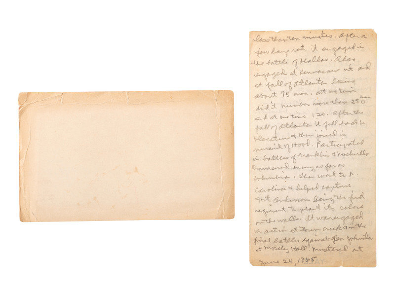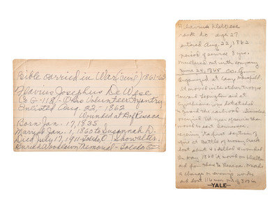2 vintage (approx. 5 by 3 in.) handwritten documents (one is an index card) containing important personal information about Dewese and his military career. The first item includes his birth/marriage/death information and his time in the service. It also states that he was “wounded at Resaca,” and that his Bible, which is part of his archive, was carried by him during the Civil War. The second document provides detail about the numerous battles that Dewese and his unit took part in. Both documents are written in a neat hand, and were likely compiled by relatives after he had passed away.