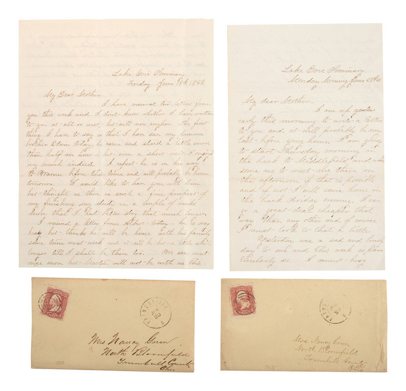 Martin Van Buren Lewis entered the United States Military Academy in 1855 and graduated in 1860. He was assigned to the US 8th Infantry (as a 2nd Lieut., as usual). The Civil War erupted just months later. Several of these letters are from recruiting assignments in northern Ohio. His letters to Mary Frances Green begin in July 1857. Some are while he is at the Academy, others while he was on summer break. Mary Green is also a scholar. At this time she was attending the Lake Erie Female Seminary at Painesville, Ohio.
