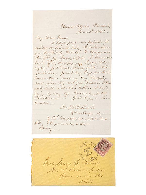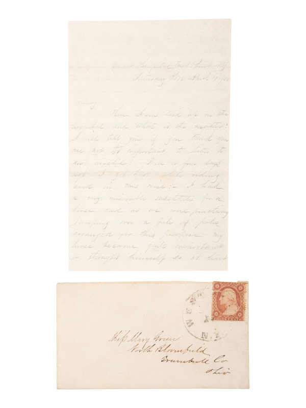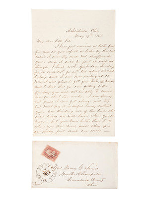 Mary received two letters from Martin in May 1862, both written at Ashtabula, Ohio. The letter of May 8 Martin describes his rooms where he is boarding and tries to arrange to pick her up to come there as soon as she is well enough (nothing specific is mentioned about her illness). He also mentions a letter he received from Albert, which he will send along to her. ”You will see from his letter that Uncle Thomas has not written to secretary Stanton yet. I shall not try to get away from my regiment any more. If they want me they will know where to find me….”
