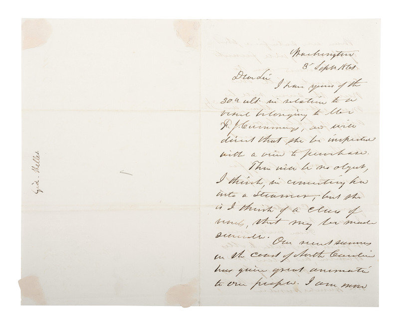 [CIVIL WAR - NAVY]. WELLES, Gideon (1802-1878). Autograph letter signed ("Gideon Welles") to Hannibal Hamlin. Washington. 3 September 1861.