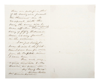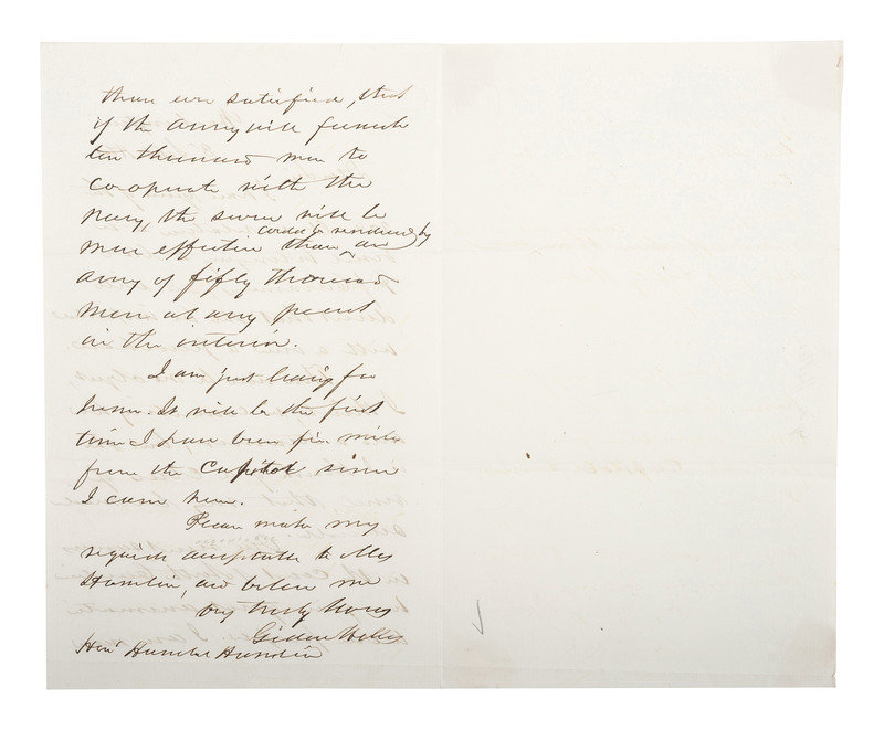 He continues, "Our recent success on the coast of North Carolina has given great animation to our people. I am more than ever satisfied, that if the Army will furnish ten thousand men to co-operate with the Navy, the s[indecipherable] will be more effective than could be rendered by an army of fifty thousand men at any p[indecipherable] in the interior." Welles then mentions that he is just leaving for home, writing, "It will be the first time I have been five miles from the Capitol since I came here."