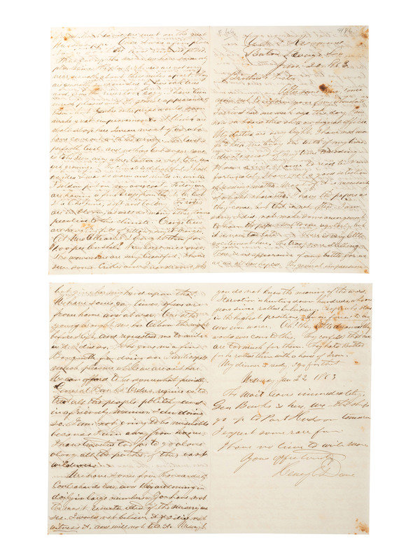 Autograph letter signed "Henry C. Dane," 3rd Massachusetts Cavalry, as Signal Officer on board the Richmond, to “Brothers and Sister,” USS Richmond, Baton Rouge, LA, 20 June 1863. 7 pp., 8vo, 20 June 1863, In part: “The general impression with us is that we have Vicksburg. If so, we shall go up to Port Hudson very soon, and there I hope to see a fight. . . . You have no idea how being in camp, and becoming familiar with arms, increases the desire for battle. We no longer have much thought for the consequences, but look only at the action—the question of injury does not come up.” Describes Baton Rouge as a burnt ruin, one year after the battle took place. “General Banks’ orders require us to treat all the people politely and in a friendly manner. . . . There are some four thousands of Contrabands here, and they are coming in daily in large numbers. You have not the most remote idea of the misery we see. . . . Starvation is hunting down hundreds, who one year since rolled in luxury. People who stood in the highest positions now are forced to beg. . . . Wednesday Jan. 22, 1863: The mail leaves immediately. Gen Banks is here, we—the ship[--]go to Port Hudson tomorrow. I expect some rare fun.” The Richmond apparently reached Port Hudson, LA, sometime after the beginning of the siege of Port Hudson, LA, which lasted, remarkably, from 22 May to 9 July 1863. Notwithstanding its duration, the siege did not result in surrender, which occurred only after Vicksburg had fallen.