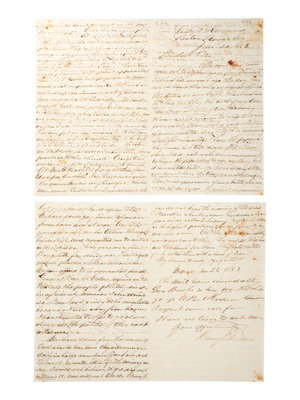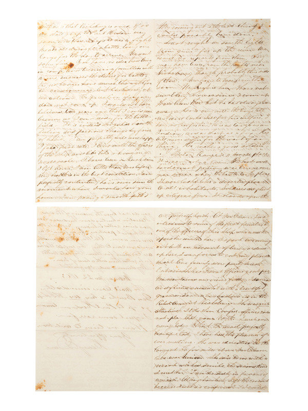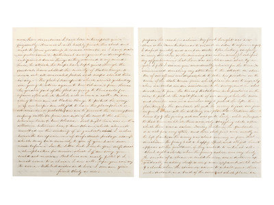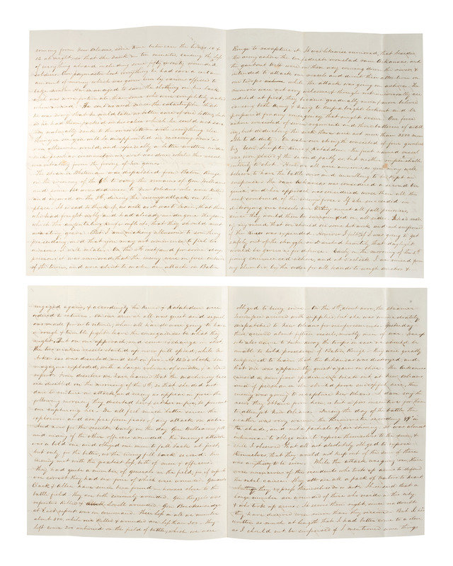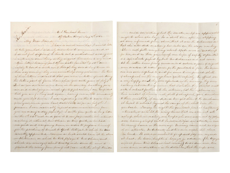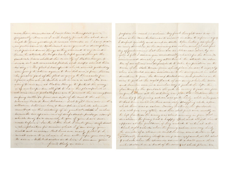 Autograph letter signed "friend Oberly as ever" to “My Dear Friend,” [his fiancée, Anna Maria Woodford of New Haven, CT], from onboard the U.S. Gunboat Kineo off Baton Rouge, 8 August 1862. 8 pp., 7 3/4 x 9 3/4 in. (creasing at folds, small spot near center fold). Naval Surgeon Aaron Shimer Oberly (1837-1918) pens an exhaustively precise and detailed account of the Battle of Baton Rouge, in which the Army and Navy combined forces to foil the Confederacy’s attempt to retake Baton Rouge. Oberly graduated from Yale Medical School and entered the Navy shortly thereafter. He rose to the rank of Chief Surgeon with the Adriatic Squadron until forced by health issues to retire in 1889. He and Woodford were married in 1866. A marvelous letter with far too much good content to represent fully through excepted quotes.