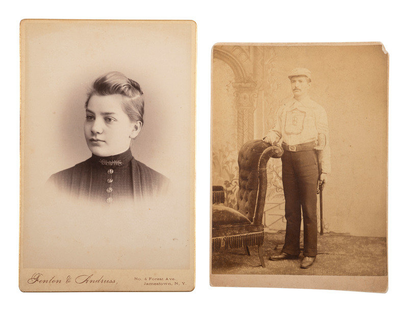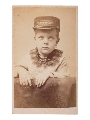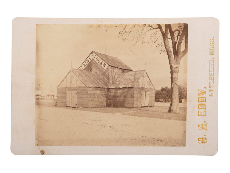 4 3/4 x 3 3/4 in. albumen cabinet photograph on cardstock mount. Attleboro, MA: A.A. Eddy, [1884]. Outdoor image of a wooden building bearing a large campaign sign "Blaine and Logan." -- 4 1/8 x 5 3/8 in. albumen cabinet photograph on cardstock mount. N.p.: N.p., [1884]. Standing studio portrait of a mustachioed man wearing a large badge with a "B L" monogram, likely for Blaine & Logan in the 1884 presidential campaign. One hand rests on a studio sofa and the other holds a sheathed sword. -- 4 x 5 3/7 in. albumen cabinet photograph on cardstock mount. Jamestown, NY: Fenton & Andruss, [1884]. Vignetted studio portrait of a woman wearing a large "Blaine" pin at her throat. -- 2 5/16 x 3 3/4 in. albumen CDV on cardstock mount. N.p.: N.p., [1884]. Studio portrait of a young child wearing a hat that reads "Cleveland." -- Together, 4 photographs, condition generally good, minor toning.
