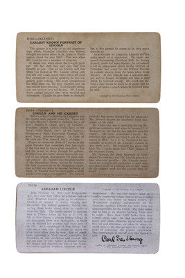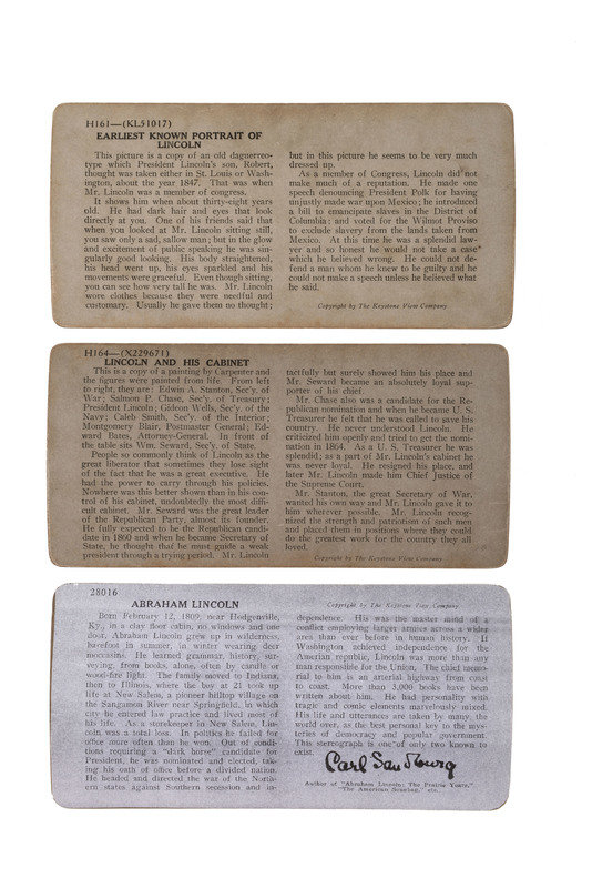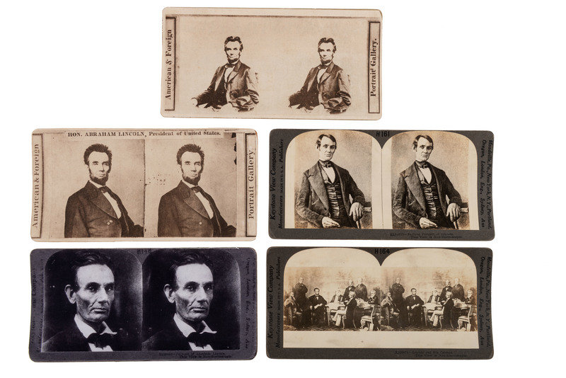 5 stereoviews depict Abraham Lincoln, including 2 views published by Keystone View Co., the first showing the "Earliest Portrait of Lincoln," the second showing "Lincoln and His Cabinet." The 3 remaining Lincoln views are modern copies made from 19th century stereoviews of Lincoln.