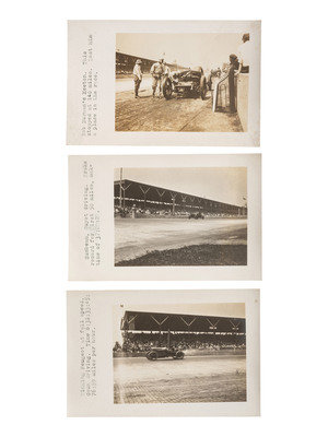 Lot of 37 total. Set of three postcards with early Indianapolis race cars. Each with 3 x 4 in. photo and typed description on one end of a 4 x 6 in. card. One with “Winning Peugot a full speed. Goux driving. Time 6:31:33:45:76:59 miles per hour.” Goux won Indy in 1913. Another has “Sunbeam, Guyot driving. Broke record for first 50 miles, mak-time of 37:29:29.” And third “Bob Burman’s Keeton. This stopped at 140 miles. Lost him a place in the race.” (Burman won in 1909)