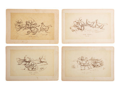 Set of four obl. cabinet cards of cartoons which give the illusion of motion, copyright J.P. Soule, 1877. Hen Trot No. 1 – 4. John Payson Soule (1828-1904) set up photography studios in Boston, then moved to Seattle later in life. His younger brother William also became a photographer.