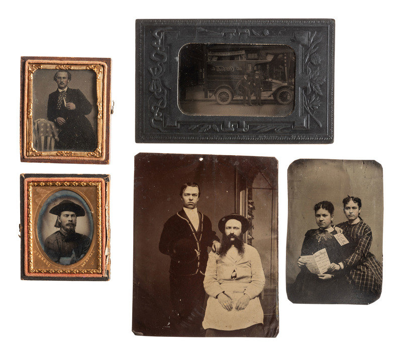 Ninth plate tintype of a man in a suit, American flag draped over the table on which he is leaning. Other tintypes include a half-plate image of two men, (Small hole top center for hanging.) A cdv-sized tintype of two women “reading” a fake letter. (Slight bend upper right corner.) 2.5 x 3.5 in.. tintype of two men standing by a Coca-cola truck (1930s vintage?).