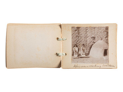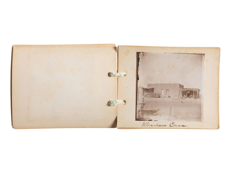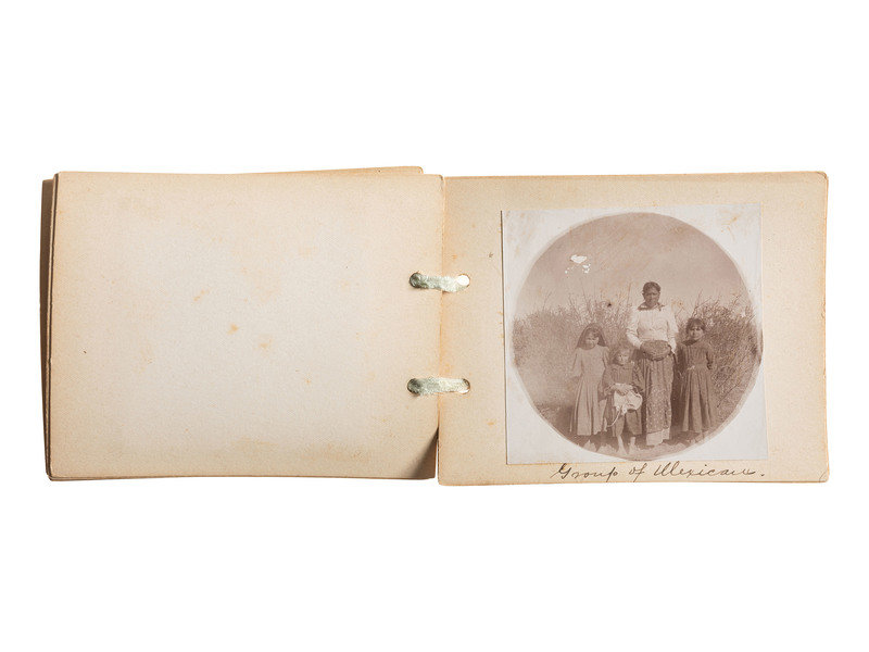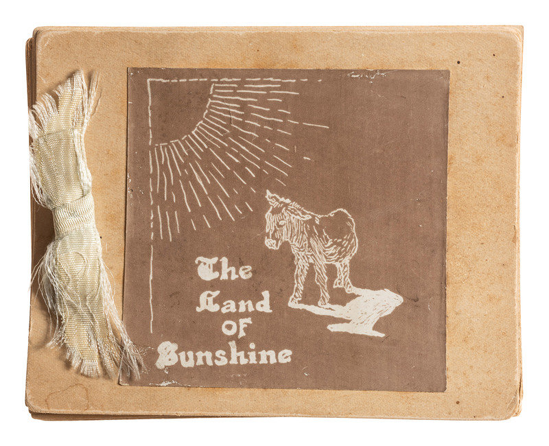 Handmade booklet with “The Land of Sunshine” on the first page. Eleven pages with ribbon tie at spine, with approx..3.25 in. square images and manuscript captions: Under the Mistletoe; Chrysanthemums (Greenhouse); Mexicans at home; Mexicans making tortillas; Mexican casa; Mexican woman; Mexican Washwoman; Group of Mexicans (appears to be mother with 3 children); Mexicans carrying wood; From our front gate. Organ ???; and Burros packed.