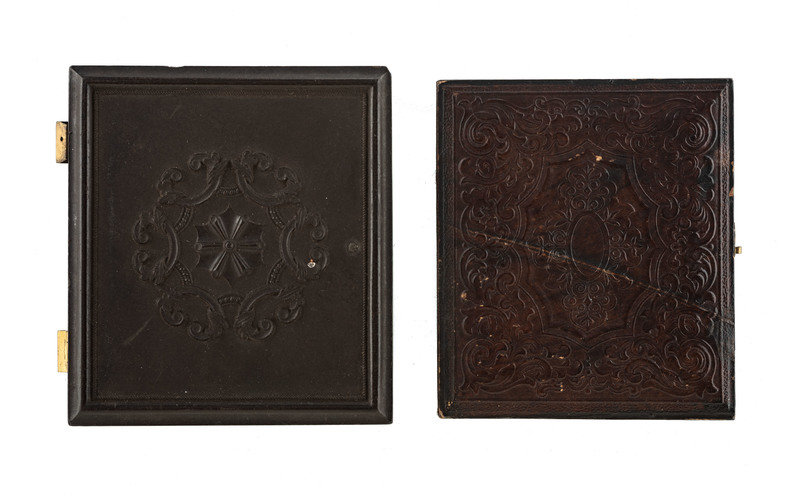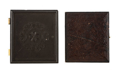 Sixth plate daguerreotype portrait of a mixed race woman wearing a patterned dress and holding a book in her lap. (Some tarnishing to edges and a bit of spotting throughout, spotting to mat.) Housed in a full pressed paper case (adhesive repair to spine, large scratch and some repair to front cover, some surface wear throughout). -- Sixth plate daguerreotype portrait of a gentleman with a goatee and a top hat resting on the table next to him. (Some tarnishing to edges and a few small scratches to plate.) Housed in a fully separated geometric Union case [Berg 3-129] (fully separated with hinge parts possibly missing, discoloration and some nicking to surface). -- Together, 2 sixth plate daguerreotype portraits.