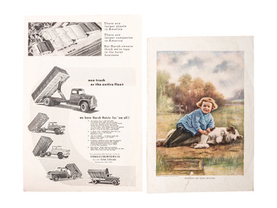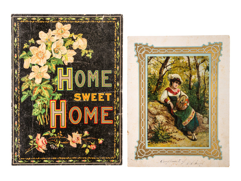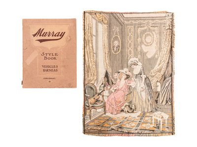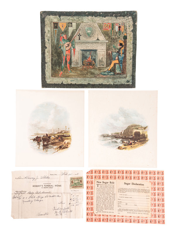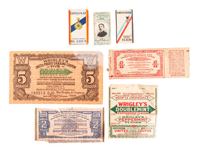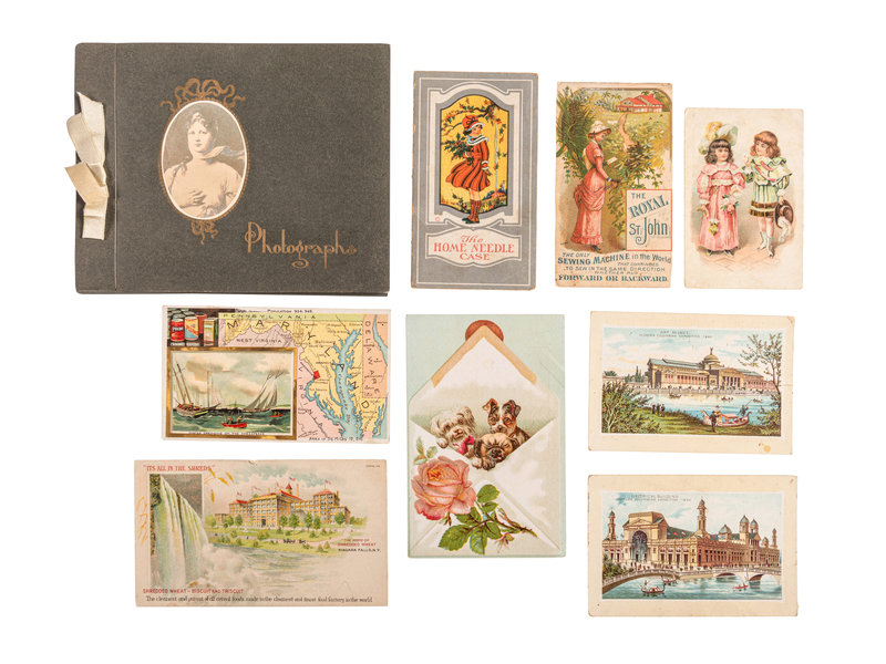 [ART AND ADVERTISING] A diverse assortment of ephemera including razor blades, advertising cards from the Chicago World's Fair, Murray's catalog of horse-drawn vehicles from 1912, red trading stamps, and more.