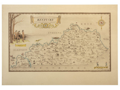 Chromolithograph, 1933, image 22 1/8 x 12 3/4 in. (25 x 17 3/8 in. sheet), on wove paper. Vignettes of "Daniel Boone and Companions View Kentucky" and "George Washington Surveying Kentucky." The state is dotted with small illustrations showing cities, towns, forts, sites of battlegrounds, natural attractions, coal and minerals, and agricultural output. RARE: OCLC locates only 3 copies.
