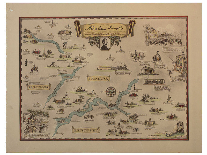 [With:] SMITH, Karl. Abraham Lincoln: A Pictorial Outline of the Life of the Sixteenth President of the United States. Chromolithograph, 1934, image 21 5/8 x 15 7/8 in. (25 x 19 1/8 in. sheet), on wove paper, small chip to margin. Vignettes from Lincoln's life geographically displayed, from his birth in Kentucky, his boyhood in Indiana, his adulthood in Illinois, and his presidency and assassination in Washington D.C.