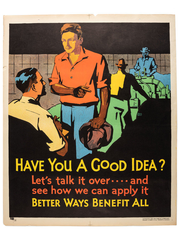 [POSTERS]. BEATTY, Frank, artist. Have You A Good Idea? Let's talk it over...and see how we can apply it. Better Ways Benefit All. Chicago: Mather & Co., 1929.
