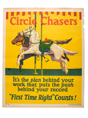 [POSTERS]. DEPUY, Hal, artist. Circle Chasers. It's the plan behind your work that puts the push behind your record. "First Time Right" Counts! Chicago: Mather & Co., 1929.