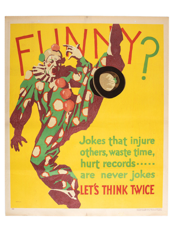 [POSTERS]. Funny! Jokes that injure others, waste time, hurt records...are never jokes. Let's Think Twice. Chicago: Mather & Co., 1929.