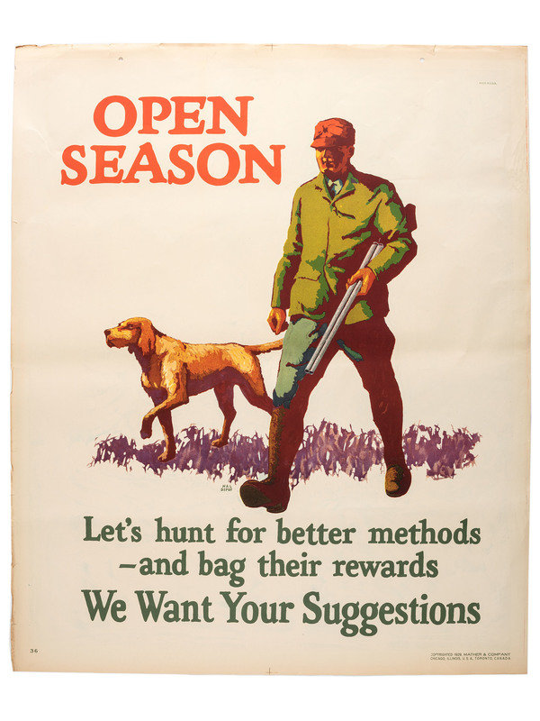 [POSTERS]. DEPUY, Hal, artist. Open Season. Let's hunt for better methods - and bag their rewards. We Want Your Suggestions. Chicago: Mather & Co., 1929.