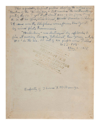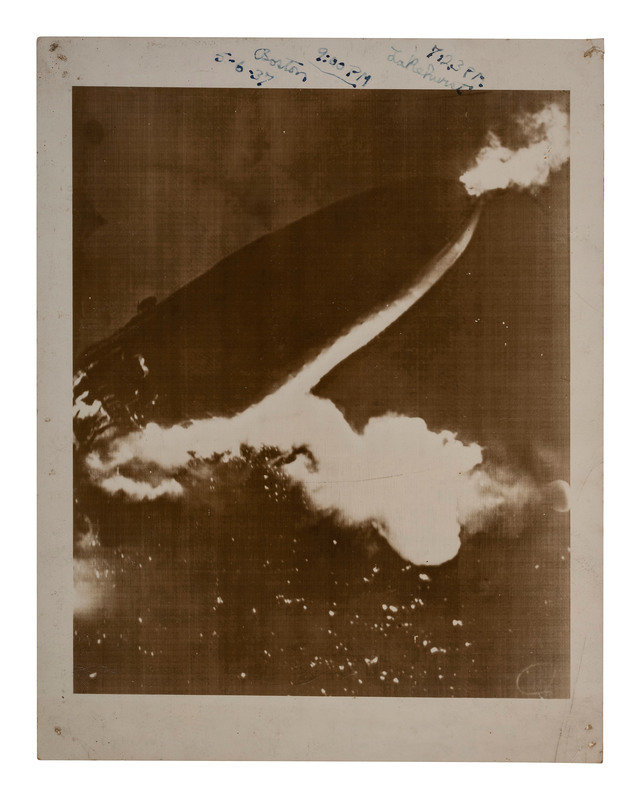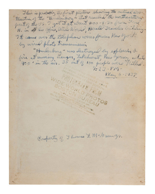 7 x 9 in. silver gelatin print of the explosion of the Hindenberg (Lakehurst, New Jersey, 6 May 1937). With Wide World Photos Boston Bureau backstamp and hand-written annotations on verso. Provenance: Previously owned by Thomas F. McGann.