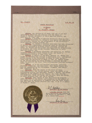 [With:] Typed Texas Senate Resolution No. 24 in Memory of Dr. Thomas F. McGann. The resolution mentions that McGann had been teaching Latin American history at the University of Texas since 1958 until his death in 1982. He was a graduate of Harvard University (both undergraduate and graduate degrees), a captain in the Naval Reserve and taught at the Naval War College in Washington, DC before going to Texas and taught for a year at the Air Force Academy as a "Very Distinguished Visiting Professor." He had authored a book on the history of Buenos Aires.