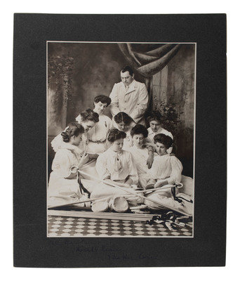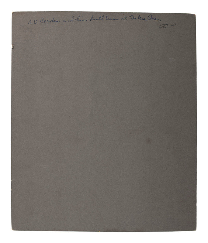Indoor studio portrait of a women's drill team and their instructor identified as A.O. Carden. Baker City, OR: Elite Studio, n.d. 6 1/4 x 8 3/8 in. silver gelatin photograph on mount. Photographer's imprint on mount recto. Ink inscription to recto and verso identify the subjects. Eight women wearing white are gathered with their beribboned poles, Carden stands behind the group wearing a white suit.