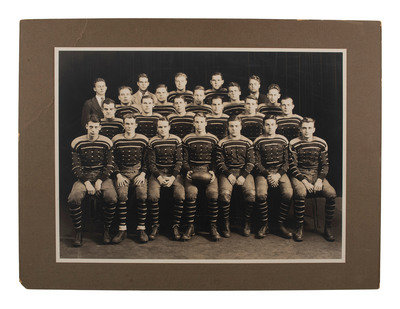 [With:] Indoor group portrait of the Bowdoin College football team. Brunswick, ME: Webber, ca 1900. 12 1/2 x 9 1/4 in. photograph on mount. PHotographer's imprint on mount.