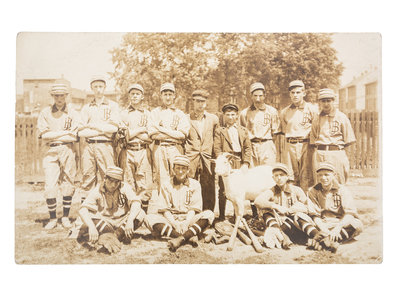 Postcard of team with entwined "JB" on their jerseys. A goat stands center front.