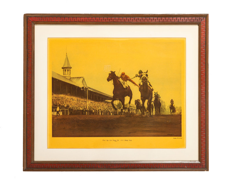 J. Hurst V "Head Play and Brokers Tip - 1933 Kentucky Derby." Numbered print, No. 40 of fifty. Framed to 22-1/2 x 26-1/4 in. Made from the Wallace Lowry photograph, "Fighting Finish" showing the stretch battle between jockeys Don Meade and Herb Fisher. Possibly made for the "Photo Finish" exhibit tracing the impact of photography on making the Kentucky Derby a celebrated sporting event.