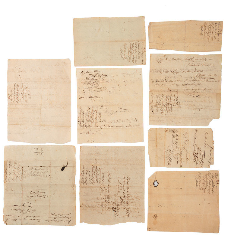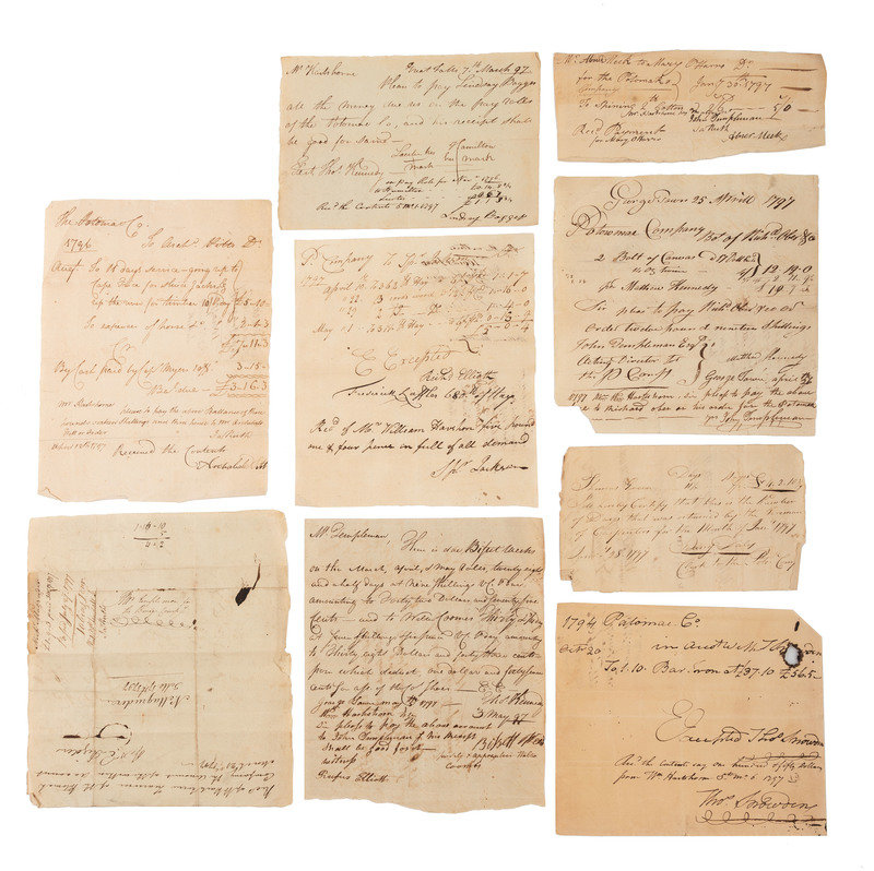 Group of nine (9) invoices/receipts from 1796-1797. All docketed on verso by Tobias Lear, one on Jan. 29, 1797, the others July 27, 1797. Includes receipts for days put in by carpenters, the cost to go up the river for timber, cost of wood and hay for the rented horses, paper, ink, canvas cloth, spinning #2 cotton, etc. Many associated with the Potomac Company.