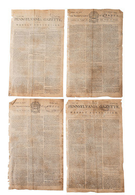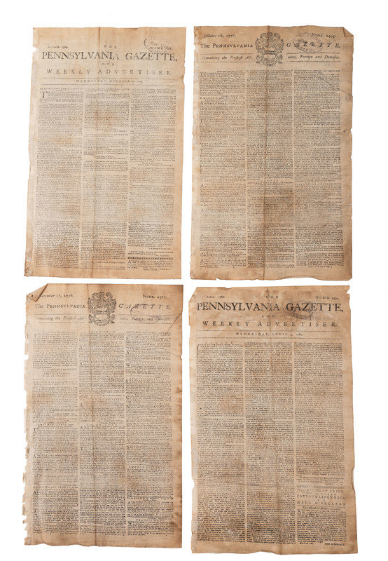 Four issues of the Pennsylvania Gazette (2pp only). Nov. 27, 1776, No. 2501; Oct, 16, 1776, No. 2495; April 5, 1780, No. 2599; and Oct. 27, 1779, No. 2576. The second two were published under The Pennsylvania Gazette and Weekly Advertiser.