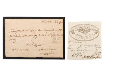 Receipt from John Gadsby’s Indian Queen Tavern, Baltimore. To Mr. Buchanan, listing purchases for July 1809. Paid and signed by John McLaughlin. John Gadsby (1766-1844) was born in England and came to the United States in 1795. He landed in Alexandria, VA, then a major port and would become the site of his first tavern. In 1805 he had lost his first wife and he married Peggy McLaughlin and sold his lease on the tavern. He moved to Baltimore, although why he did so is uncertain. Gadsby purchased the Indian Queen Hotel, a large tavern with all the “modern” (of the day) innovations. Gadsby and Peggy had a son in 1808, but Peggy died in 1812. Gadsby married Providence Langworthy, of the prominent Norris family. They attended many events at the Indian Queen Hotel and welcomed many notable guests (including Francis Scott Key, who reportedly finished the Star-Spangled Banner while staying there). Gadsby lost everything in the Panic of 1819, leaving Baltimore and moving on to Philadelphia then Washington (following the stagecoach line). There he opened the Franklin Hotel, again catering to the most distinguished men in society. He later opened the National Hotel on Pennsylvania Avenue. He retired in 1836. When he died in 1844 he was buried in the Congressional Cemetery.