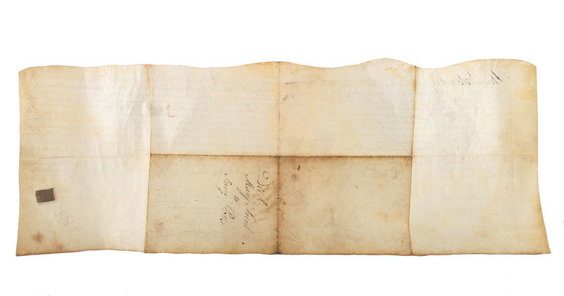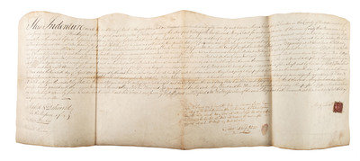 Indenture, vellum. 10 x 26 in. For sale of a "plantation or piece of land called the Walnut Tract." Mary Trent to Stacy Potts. Shippen has noted that he spoke with Mary Trent as a representative of the court.