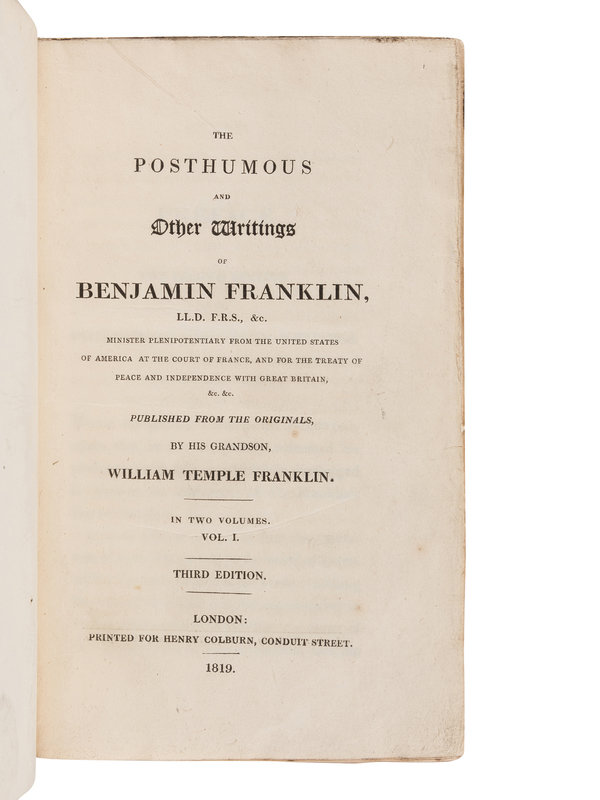 FRANKLIN, Benjamin (1706-1790). The Posthumous and Other Writings of Benjamin Franklin. London: for Henry Colburn, 1819. Third edition.