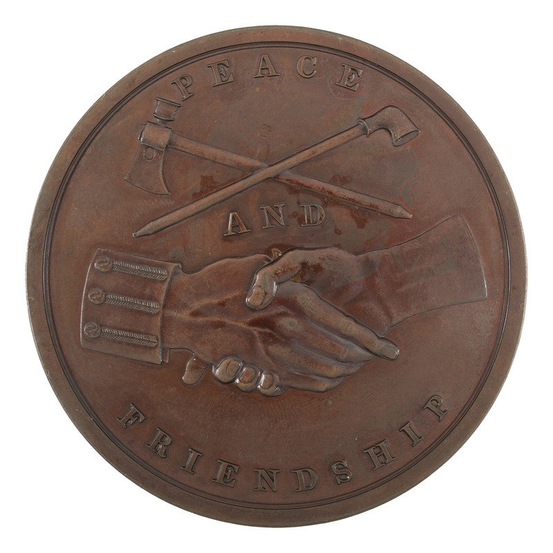 Bronze medal, 3 in. in diameter. Recto with "Andrew Jackson President of the United States A.D. 1829" and profile of Jackson. Verso with hands shaking, above are a crossed pipe tomahawk and an elbow pipe (looks like one of those little clay pipes). "Peace and Friendship." (no longer has its government presentation box)
