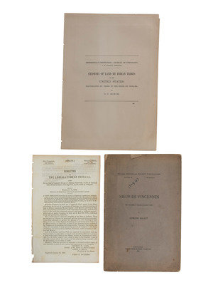 Mallett, Edmond. Sieur de Vincennes. Indiana Historical Society Publications, Vol. III (3), No. 11. Indianapolis: The Bowen-Merrill Company, 1897. 8vo, printed wraps, pp. 41-62.