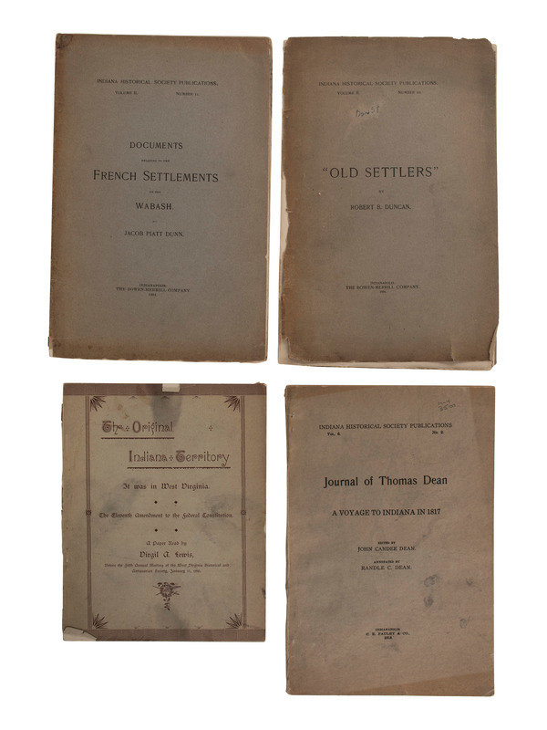 Dunn, Jacob Piatt. Documents Relating to the French Settlements on the Wabash. Indiana Historical Society Publications, Vol. II (2), No. 11. Indianapolis: The Bowen-Merrill Company, 1894. 8vo, printed wraps, 40pp.