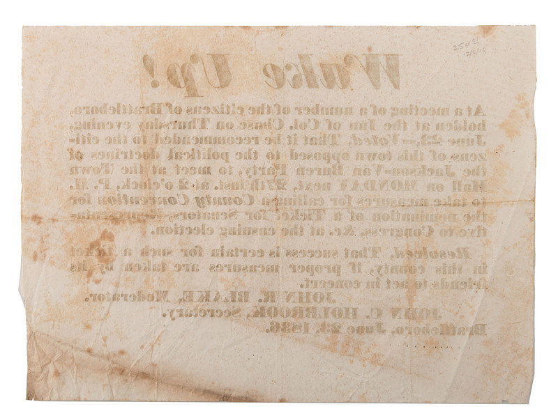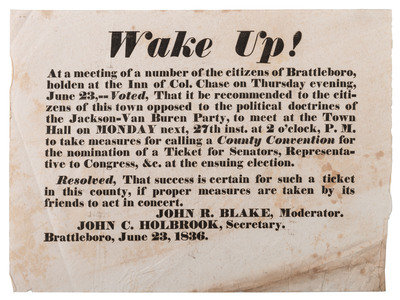 [HARRISON, William Henry]. Wake Up! campaign broadside. Brattleboro, VT: N.p., 1836.