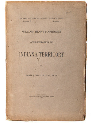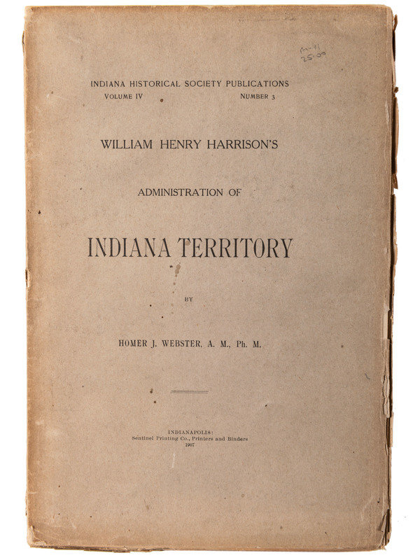 [With:] Webster, Homer J. William Henry Harrison’s Administration of Indian Territory. Indianapolis: Sentinel Printing Co., 1907. Indiana Historical Society Publications, Vo. IV, No. 3. 8vo, printed wraps, 295pp., uncut. (browning of edges with some chipping)
