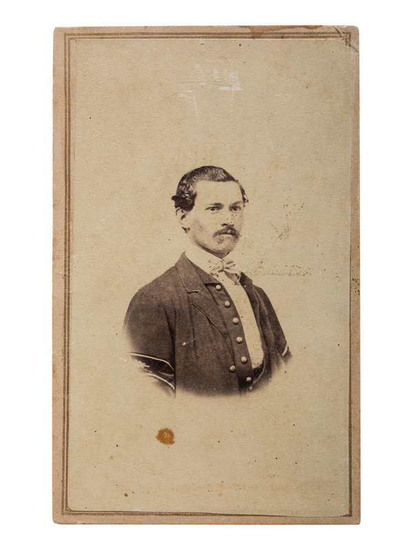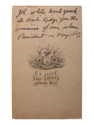 CDV of head guard for Abraham Lincoln at Oak Ridge Cemetery. 24th Michigan Volunteer Regiment was the honor guard. Star Gallery, Jackson, Michigan. Manuscript note on verso of CDV: "J.R. while head guard at Oak Ridge for the remains of our slain President - May 1865."