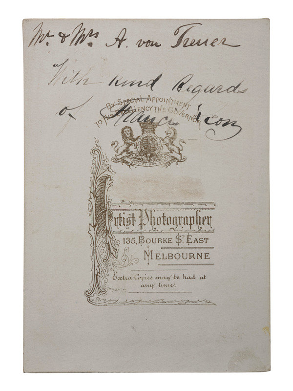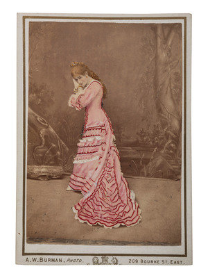 Cabinet photo of young woman with extensive hand-coloring of her dress, cheeks and hair. Photographer's identification "A.W. Burman, Melbourne." There is a lion and unicorn crest both recto and verso, so this is Australian. On verso is a gift inscription.