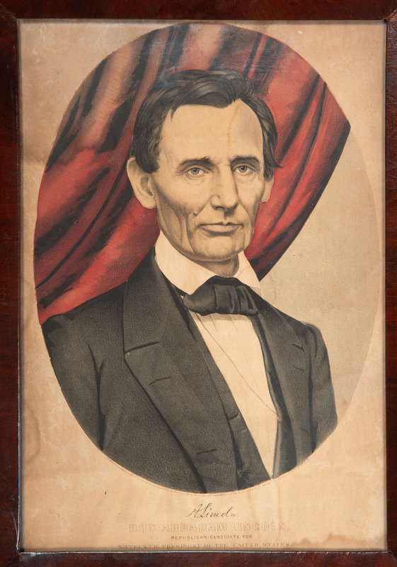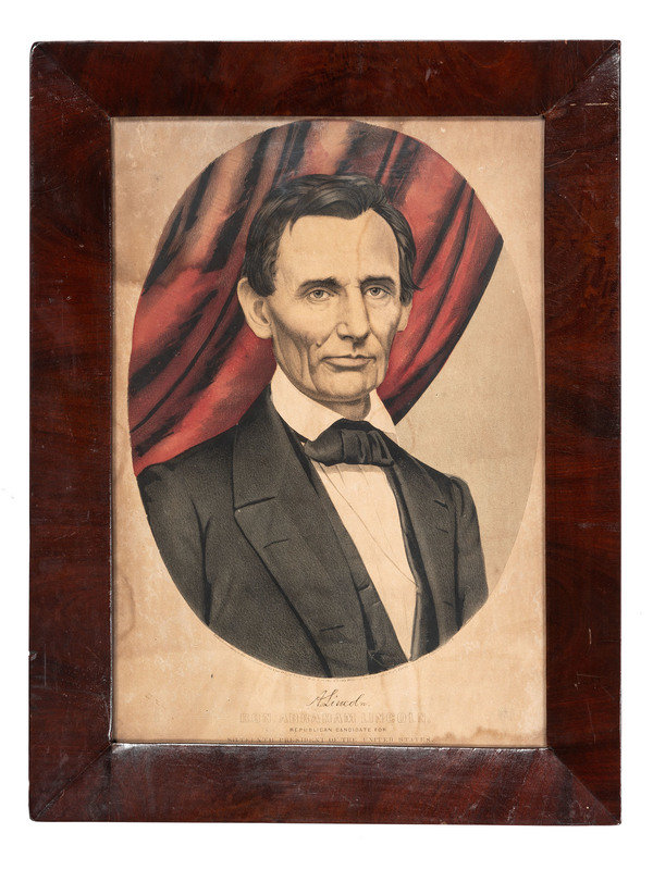 Abraham Lincoln campaign print, framed to 12.75 x 17 in. Hand-colored lithograph by Currier & Ives, titled: "Hon. Abraham Lincoln Republican Candidate for Sixteenth President of the United States." Likely 1860 since he is beardless (date worn on print). With facsimile signature. (water stains visible along left edge)