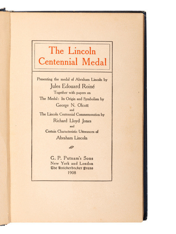The Lincoln Centennial Medal. Presenting the Medal of Abraham Lincoln by Jules Edouard Roiné, Together with Papers on The Medal: Its Origin and Symbolism by George N. Olcott, and The Lincoln Centennial commemoration by Richard Lloyd Jones and Certain Characteristic Utterances of Abraham Lincoln. New York and London: G.P. Putnam's Sons, The Knickerbocker Press, 1908.