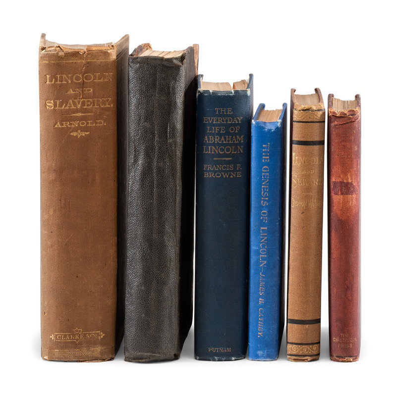 ARNOLD, Isaac N. The History of Abraham Lincoln and the Overthrow of Slavery. Chicago: Clarke & Co., 1867. -- WELLES, Gideon. Lincoln and Seward. New York: Sheldon & Company, 1874. -- HARRIS, T.M. Assassination of Lincoln: A History of the Great Conspiracy. Boston: American Citizen Company, John K. Hastings, 1892. One-half black morocco (heavy loss, rebacked). -- SCHURZ, Carl. Abraham Lincoln. Cleveland, New York, Chicago: The Chautauqua Press, 1899. Later edition. -- CATHEY, James. H. The Genesis of Lincoln. N.p.: N.p., [1899]. -- BROWNE, Francis Fisher. The Every-Day Life of Abraham Lincoln. London: John Murray, 1914. -- Together, 6 works in 6 volumes, all FIRST EDITION, except as noted, 8vo and 12mo, all in publisher's cloth, condition generally very good.