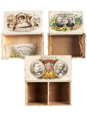 [HARRISON, Benjamin] -- [CLEVELAND, Grover]. A group of cigar boxes and early American pattern glass cups from the 1884, 1888, and 1892 presidential campaigns, comprising: