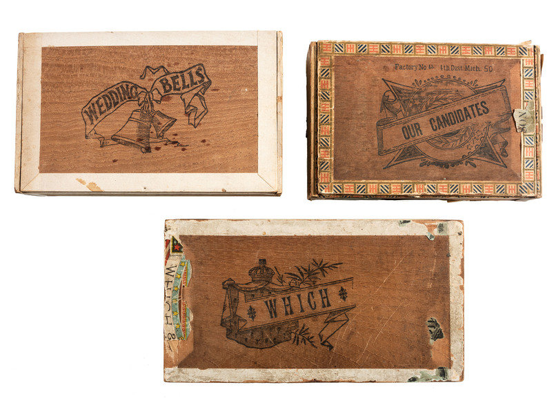 Three cigar boxes: Wood with burned design on outside, lithographs on lid. "Wedding Bells" with image of Frances Cleveland. Surrounding vignettes of a couple (presume the Clevelands) taking a stroll, and one of a carriage pulling up to the White House. 5 8 x 2-1/4 in.