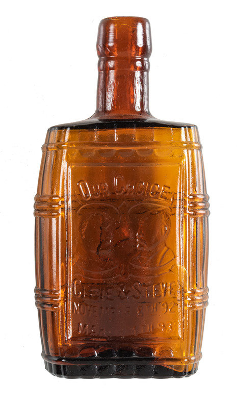 Brown glass flask with portraits "Cleve & Steve" and dated November 8th 92. 5-3/4 in. high.