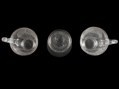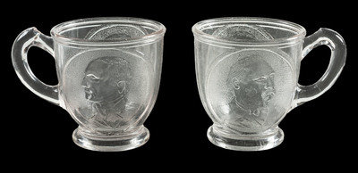 Clear glass handled cup with portraits of Cleveland and Thurman (1888). 3 in. high and approx. 3 in. diam.