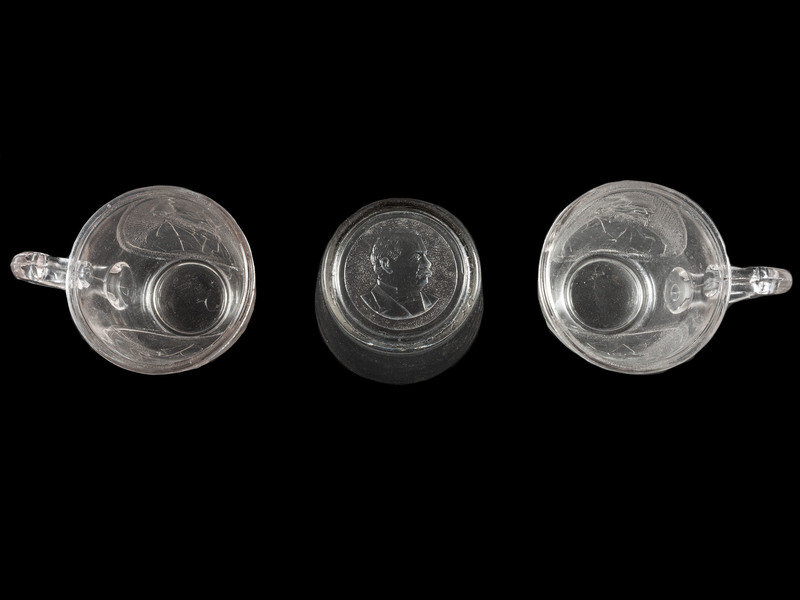 Clear glass handled cup, with portraits of Benjamin Harrison and Levi Morton (1888). 3in. high, nearly 3 in. diam.